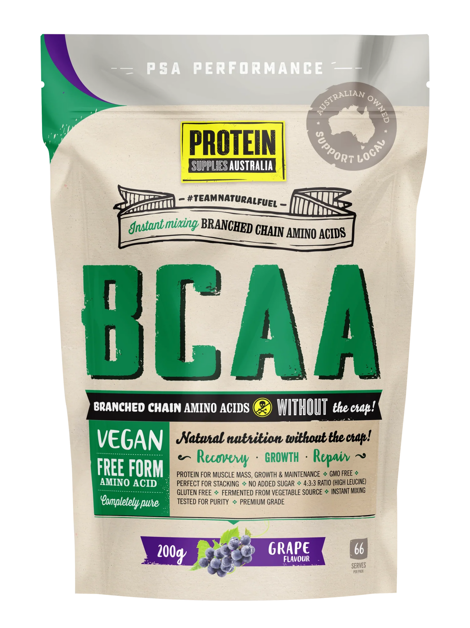 Protein Supplies Australia's premium Branched Chain Amino Acids (BCAAs) include 3 of the 9 essential amino acids: leucine, Isoleucine and valine. These 3 amino acids can only be sourced from your diet and have been shown to assist with muscle repair, maintenance and growth.