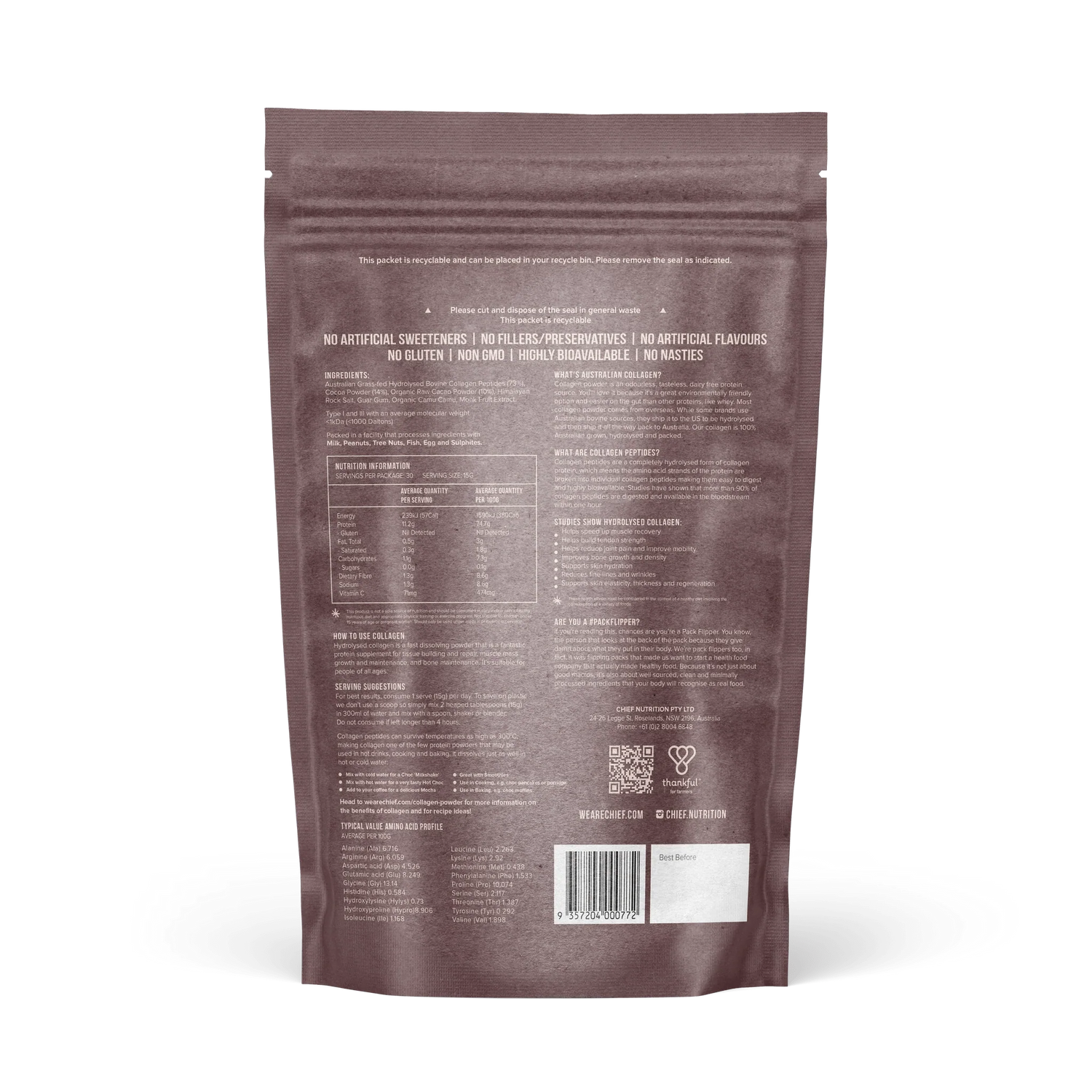 For best results, consume 1 serve (15g) per day. To reduce plastic we don’t use a scoop so simply mix 2 heaped tablespoons (15g) in 300ml of cold water and mix with a spoon, shaker or blender. Do not consume if left longer than 4 hours. Also great to add protein to your smoothies, coffee, tea, pancakes, baking and more.