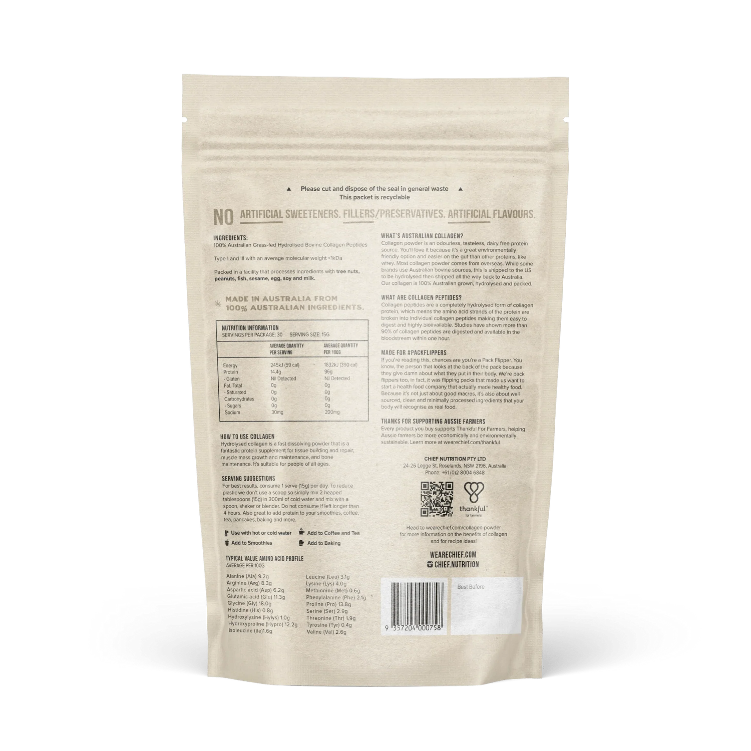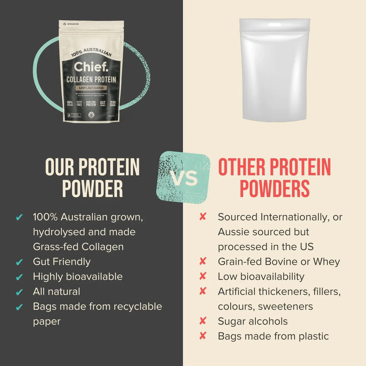 Most collagen powder comes from overseas. While some brands use Australian bovine sources, they ship raw ingredients to the US to be hydrolysed then ship it all the way back to Australia. Our collagen is 100% Australian grown, hydrolysed and made.