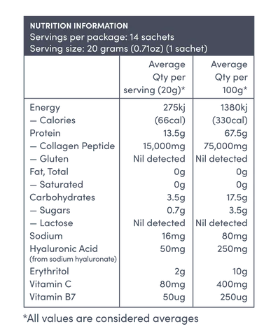 Each serving contains an impressive 15g of Collagen, 80mg Vitamin C, 50mg Hyaluronic Acid and 50mcg Biotin.