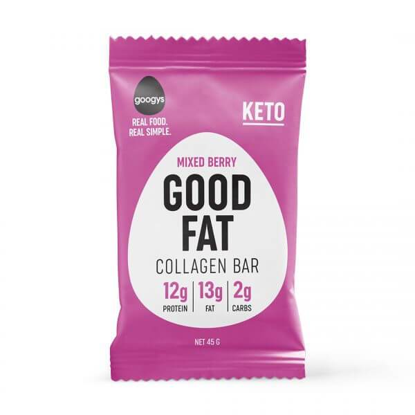 Googys Mixed Berry Good Fat Collagen Bars are delicious keto friendly protein bars, made in Australia with great ingredients like organic coconut, collagen peptides, free range egg white and MCT oil,
