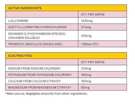 Soluble Maize Fibre, L-Glutamine, Natural Flavour, Mineral Salts (Calcium Citrate, Sodium Chloride, Magnesium Citrate, Potassium Chloride), Acidity Regulator (Malic Acid), Anti-Caking Agent (Silicon Dioxide), Acetyl-L-Carnitine Hydrochloride, Seaweed (Lithothamnion species), Sweetener (Sucralose), Minerals (Zinc Gluconate, Sodium Selenite), Probiotic (Bacillus coagulans), Vitamin B Complex (B3 (Niacin), B5 (Pantothenic Acid), B6 (Pyridoxine Hydrochloride), B2 (Riboflavin), B1 (Thiamin Hydrochloride), B9 (Folic Acid), B7 (D-Biotin), B12 (Cyanocobalamin)), Colour (Carmoisine).