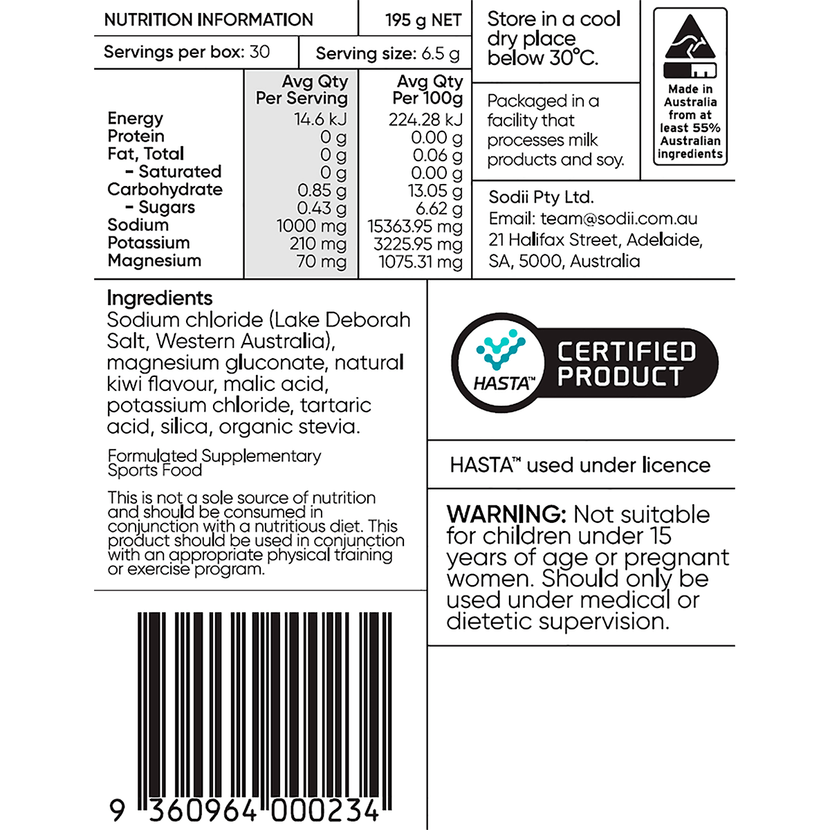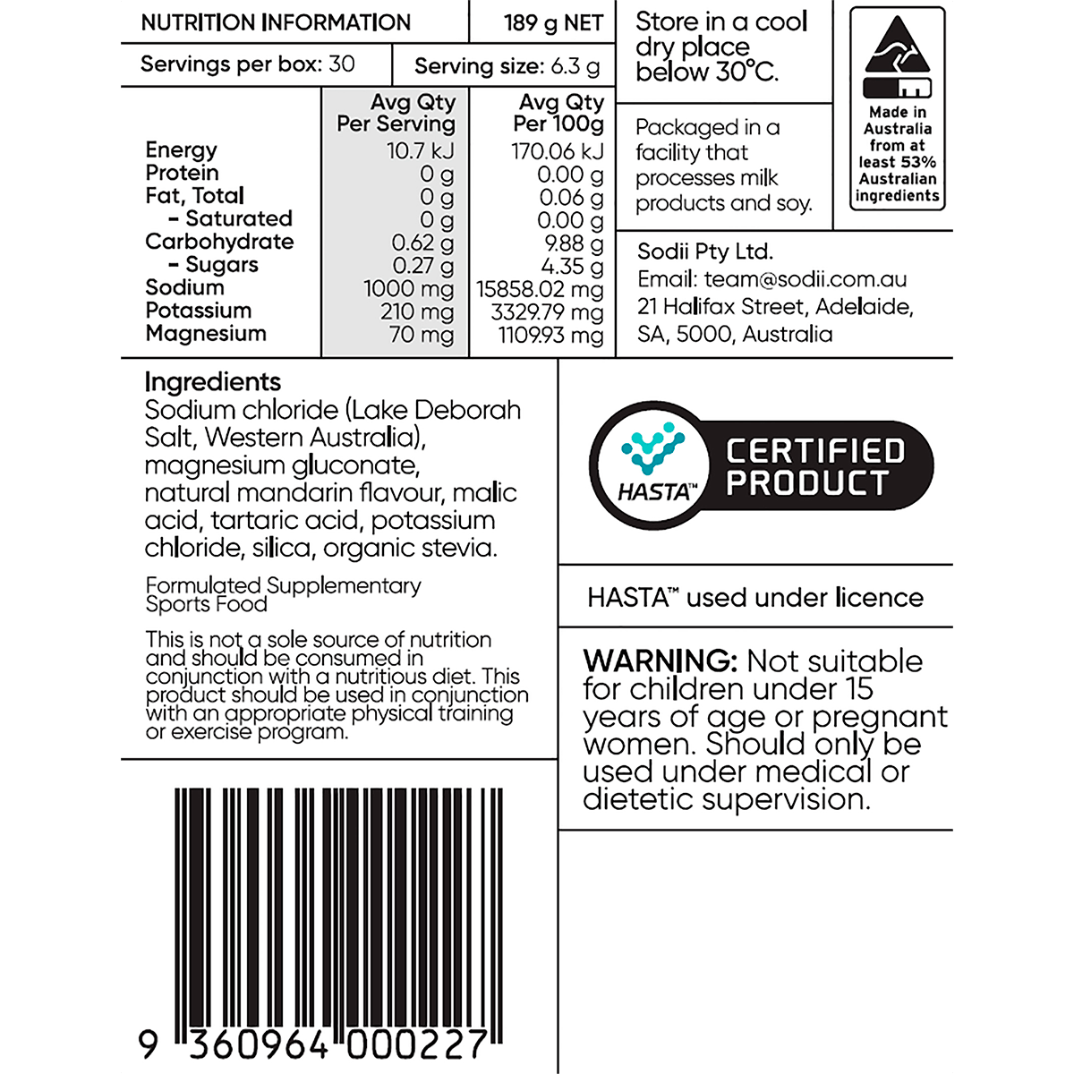 Sodium Chloride (Organic Lake Salt, Lake Deborah, WA), Magnesium Gluconate, Malic Acid, Natural Raspberry Flavour, Potassium Chloride, Tartaric Acid, Silica, Organic Stevia.