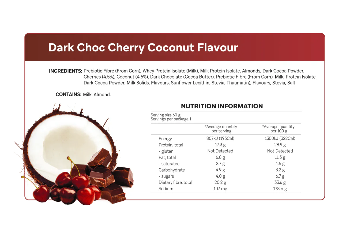 The Dark Choc Cherry flavour is an unforgettable, blissful indulgence. It tastes like ripe, juicy cherries and moist coconut smothered in rich, dark chocolate.  But without the carbs!