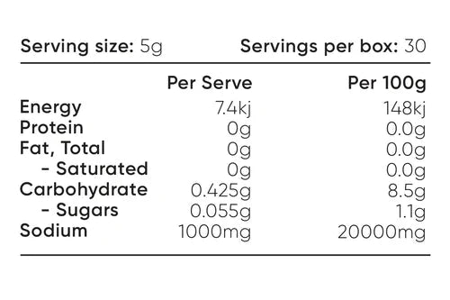 Sodium chloride (Lake Deborah Salt, Western Australia), citric acid, tartaric acid, natural berry flavour, potassium chloride, magnesium gluconate, silica, organic stevia.