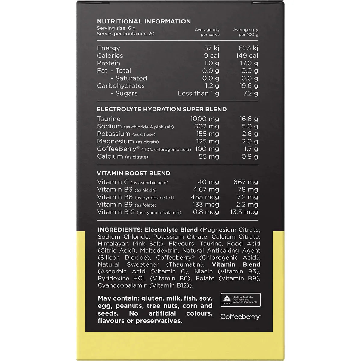 Electrolyte Blend (Magnesium Citrate, Sodium Chloride, Potassium Citrate, Calcium Citrate, Himalayan Pink Salt), Taurine, Flavours, Coffee Berry Extract (Chlorogenic Acid), Food Acid (Citric Acid), Maltodextrin (Corn), Natural Anticaking Agent (Silicon Dioxide), Ascorbic Acid (Vitamin C), Natural Sweetener (Thaumatin), Niacin (Vitamin B3), Pyridoxine HCL (Vitamin B6), Folate (Folic Acid), Cynocobalamin (Vitamin B12)
