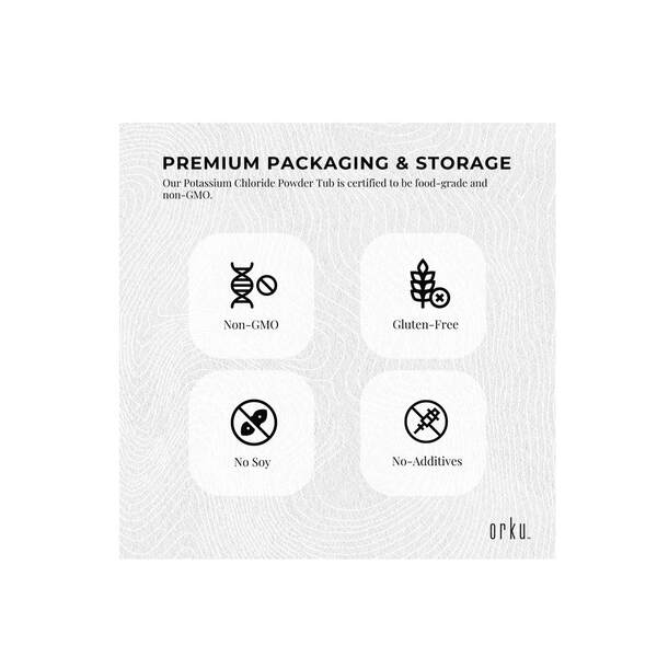 Orku Pure Potassium Chloride (KCL) E508 is a food grade powder that comes in a resealable bag. It is a common and naturally occurring mineral. It is generally uséd to provide potassium enrichment in foods and as a salt replacer to reduce the sodium content in food.