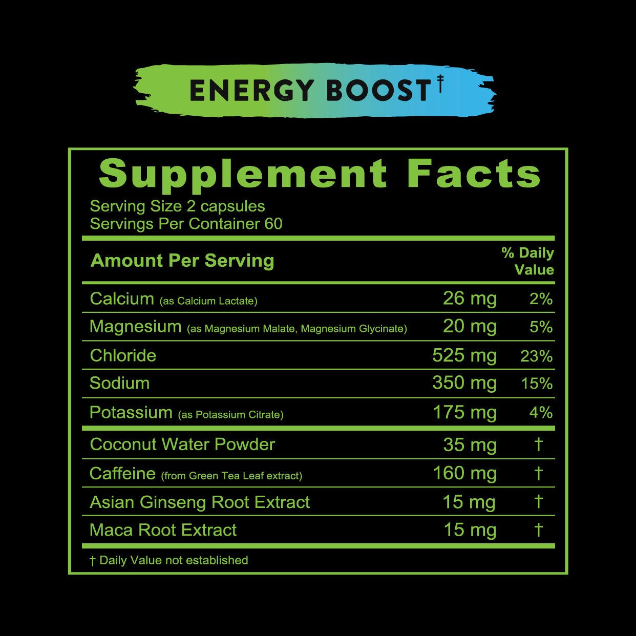 Re-Lyte Energy Boost Caps are the only energy support capsule that contains our Re-Lyte Electrolyte Mix. Low electrolyte levels cause fatigue, so keeping your electrolyte levels optimized keeps your energy levels up.